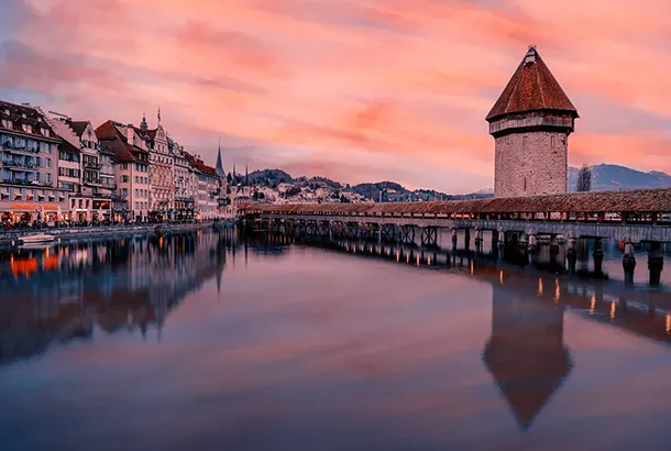 Lucerne is an attractive Swiss city surrounded by the iconic Swiss Alps. The city is known for its charming Old Town, medieval architecture, and stunning mountain and lake views. The city also hosts one of the most photographed landmarks in history, the Chapel Bridge, a wooden bridge constructed in the 14th century. The bridge is attacked to an octagonal tower, which offers locals and visitors a glimpse into the city’s medieval history. Besides, visitors and locals are attracted to the Lion Monument, a poignant sculpture designed to remember Swizz Guards who sacrificed their lives during the French Revolution.